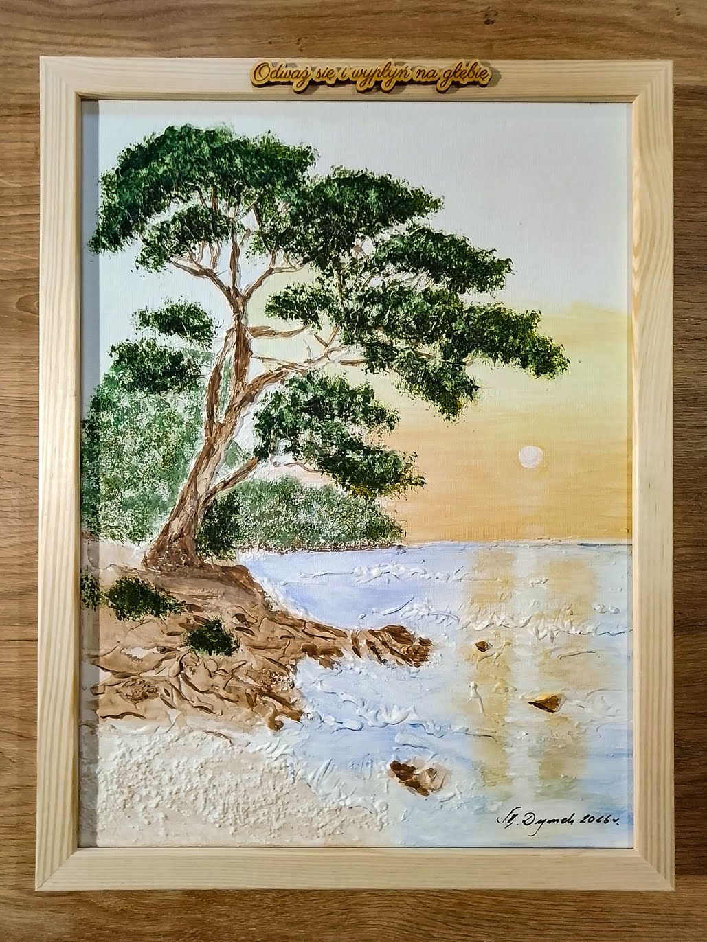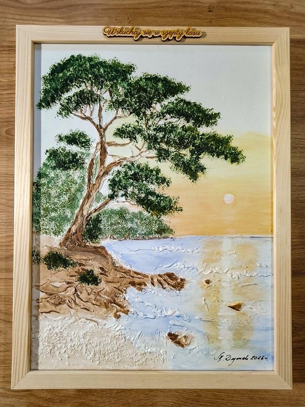 - Wyjątkowe Motto, Personalizacja: Nad obrazem znajduje się starannie wykonany, drewniany napis: (1 do wyboru z 3 dostępnych):"Wsłuchaj się w szepty lasu", "Odważ się i wypłyń na głębię" lub "Przemierz świat wzdłuż i wszerz". Każde przesłanie nadaje całości głębokiego, symbolicznego znaczenia – idealne dla miłośnika przyrody, podróżnika, marzyciela lub osoby wkraczającej na nową drogę życia. Wyjątkowy detal nadaje całości poetyckiego charakteru i sprawia, że obraz jest jedyny w swoim rodzaju. Personalizacja czyni go idealnym prezentem na jubileusz, rocznicę, podziękowanie, itp.