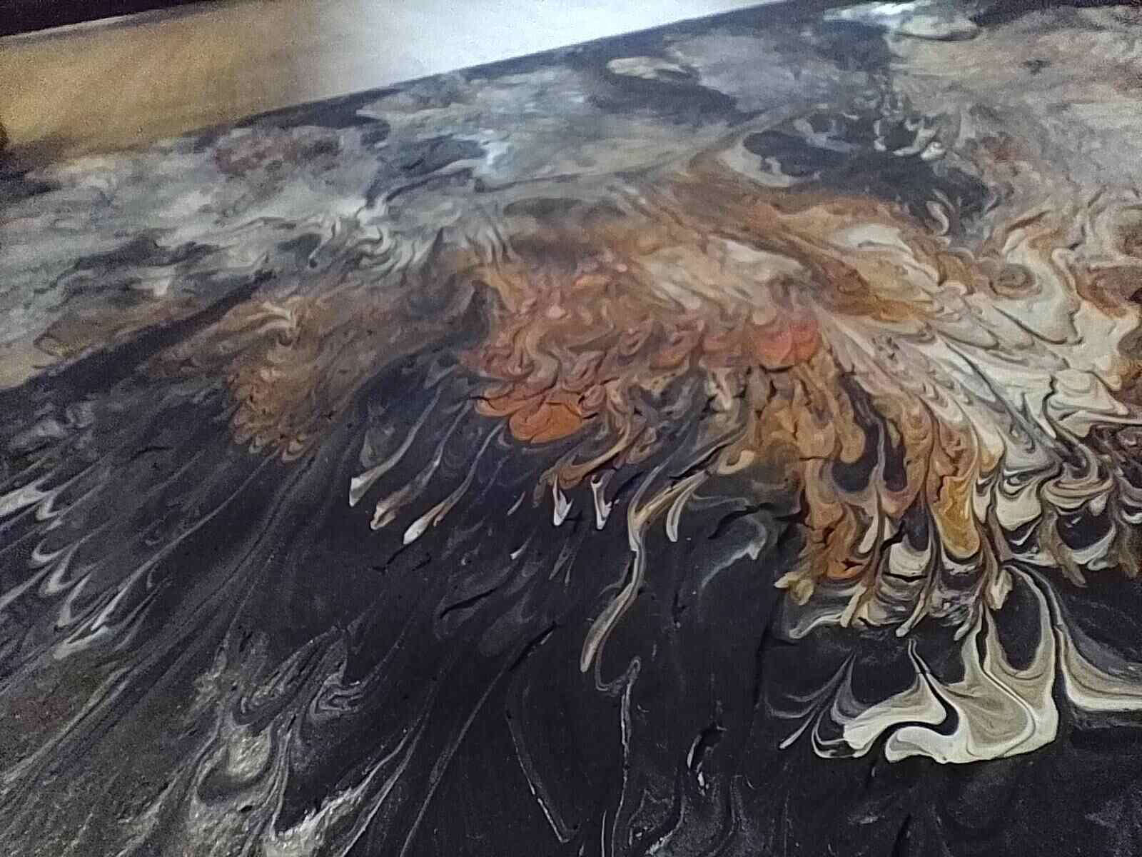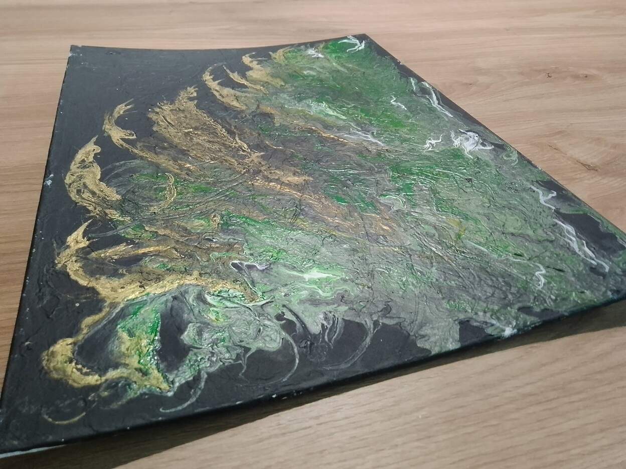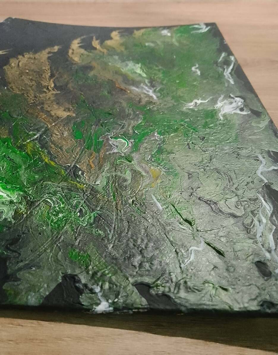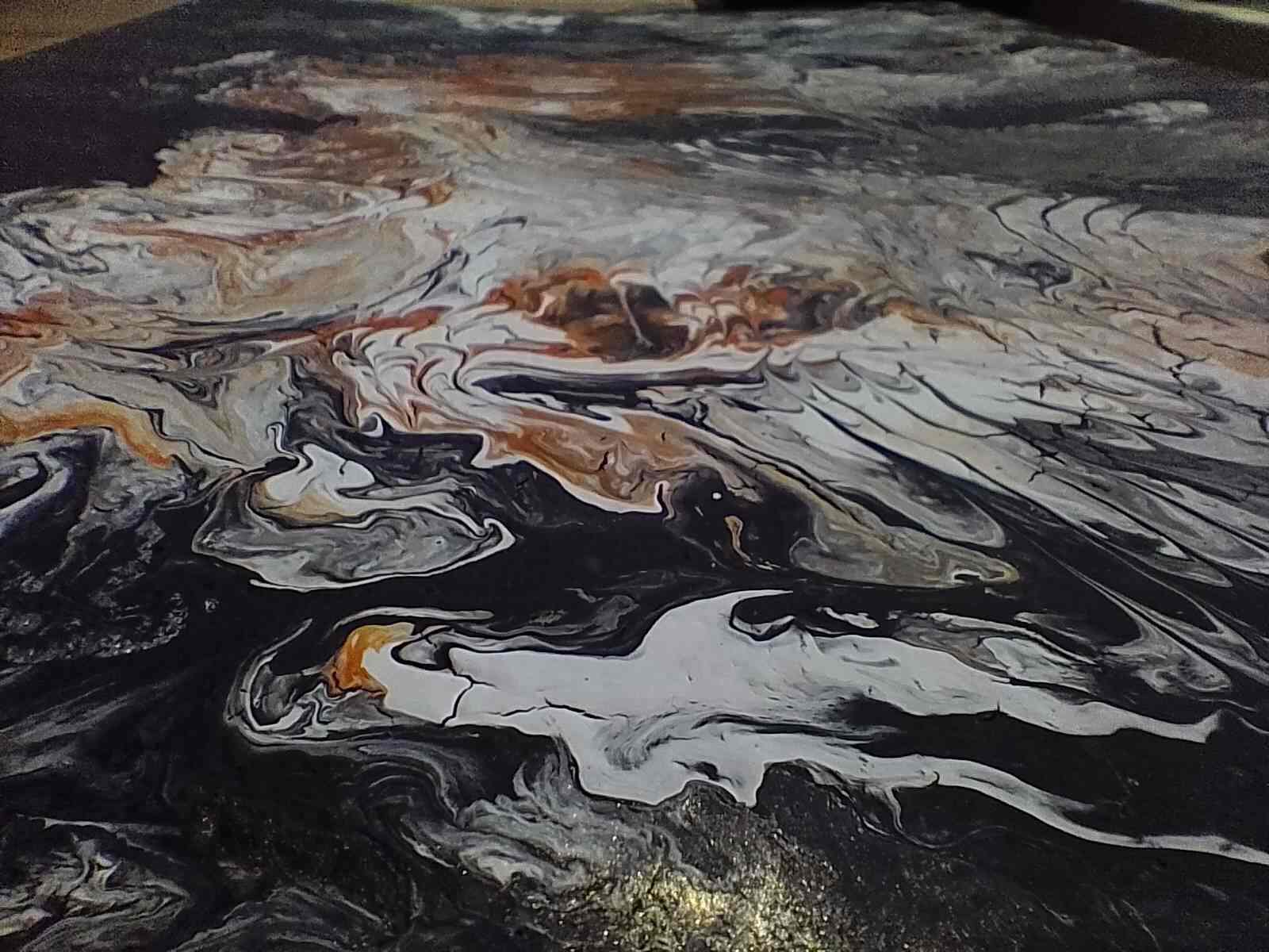 Obrazy wykonane metodą POURINGU są bardziej sztywne (duża ilość farby zużyta do ich wykonania), miejscami strukturalne (widoczne rzeźby, rysy, pęknięcia), podłoże jest nieco wygięte i poplamione farbą od spodu, ale po włożeniu do ramy się naprostuje, a tył nie będzie widoczny. Wszystkie cechy czynią te obrazy bardziej oryginalnymi, niepowtarzalnymi i pozytywnie podkręcają efekt wizualny dekoracji.