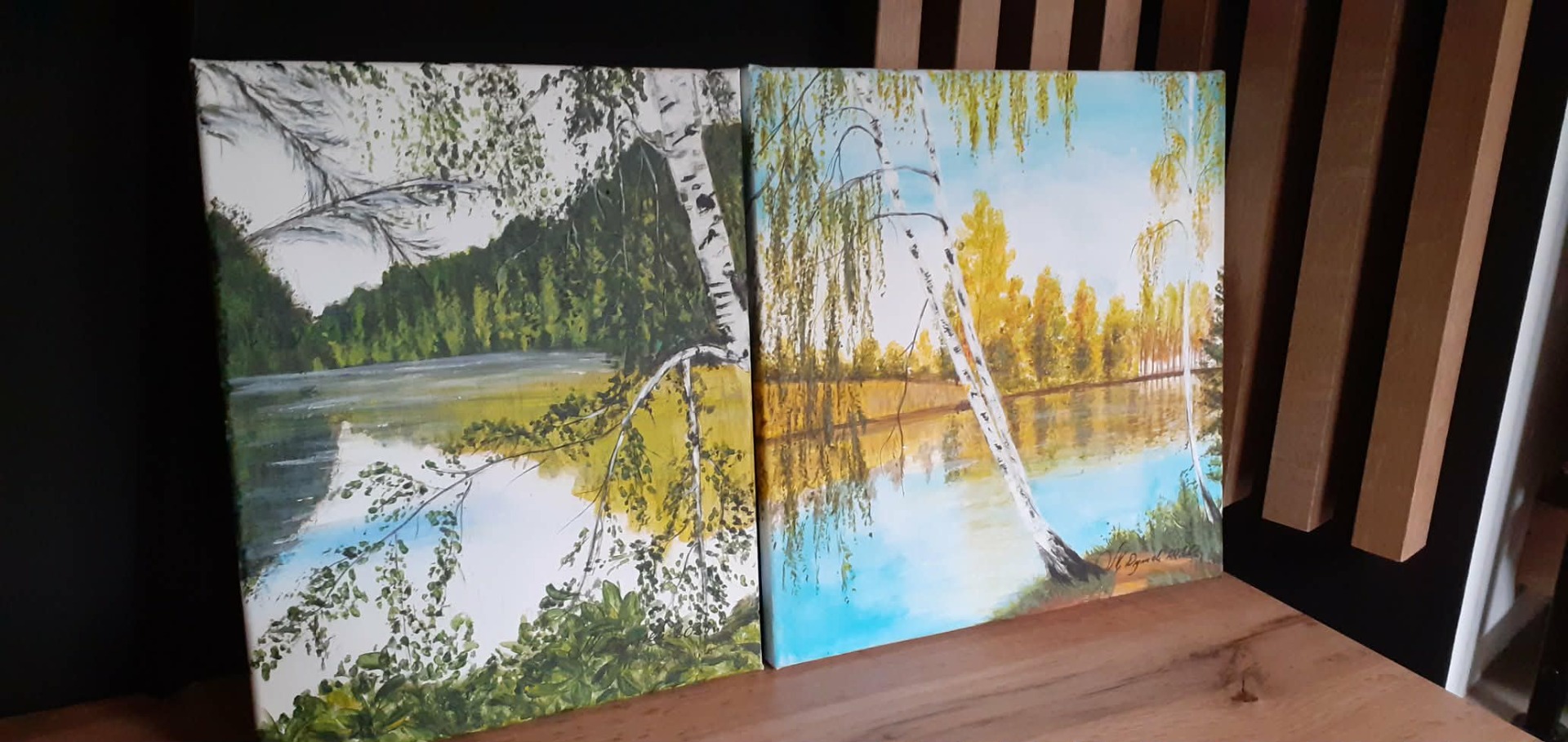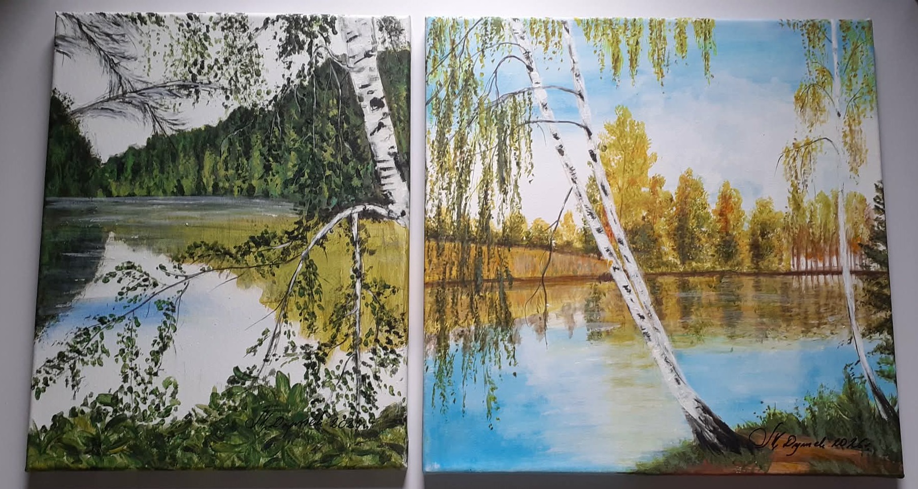 Tematyka: Polski krajobraz z motywem brzóz, jeziora i lasu. Obrazy emanują ciszą i nostalgią