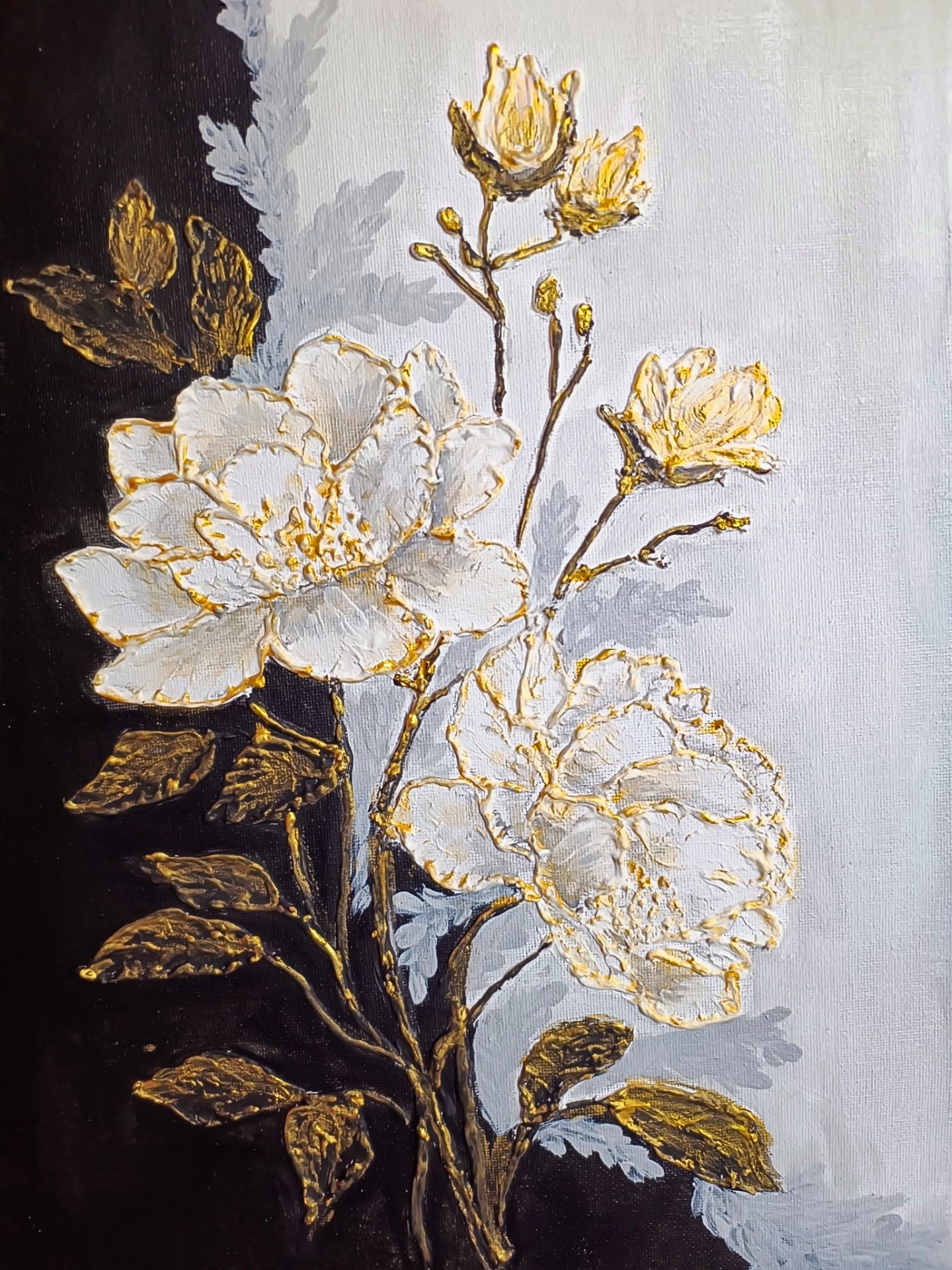 Dopełnij swoje wnętrze nutą luksusu - unikatowy, ręcznie malowany obraz o motywie florystycznym, który łączy w sobie klasyczną elegancję bieli z luksusowym blaskiem złota. Totalna nowość w naszej galerii! Obraz strukturalny (impasto) nadający kwiatom trójwymiarowy efekt i sprawia, że obraz "żyje" i mieni się w zależności od oświetlenia.