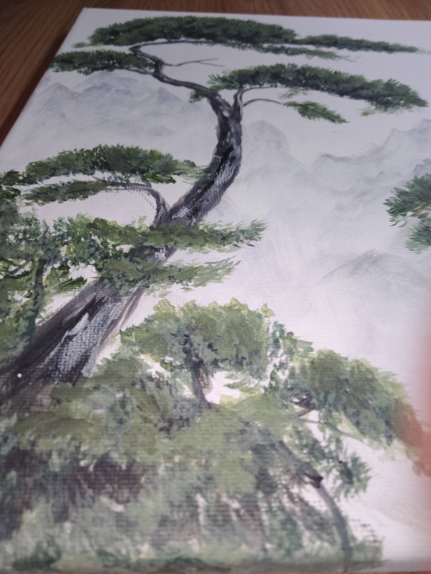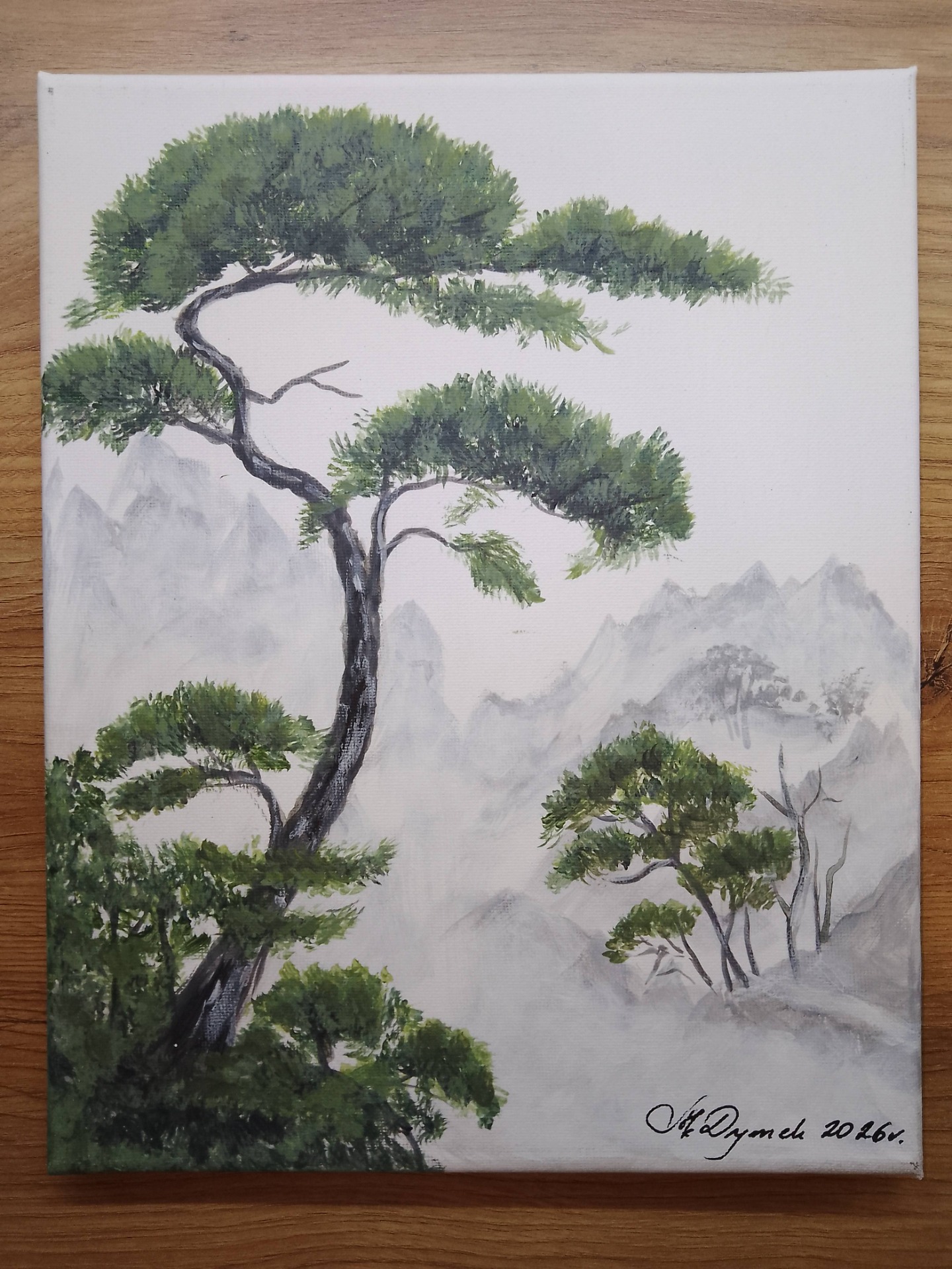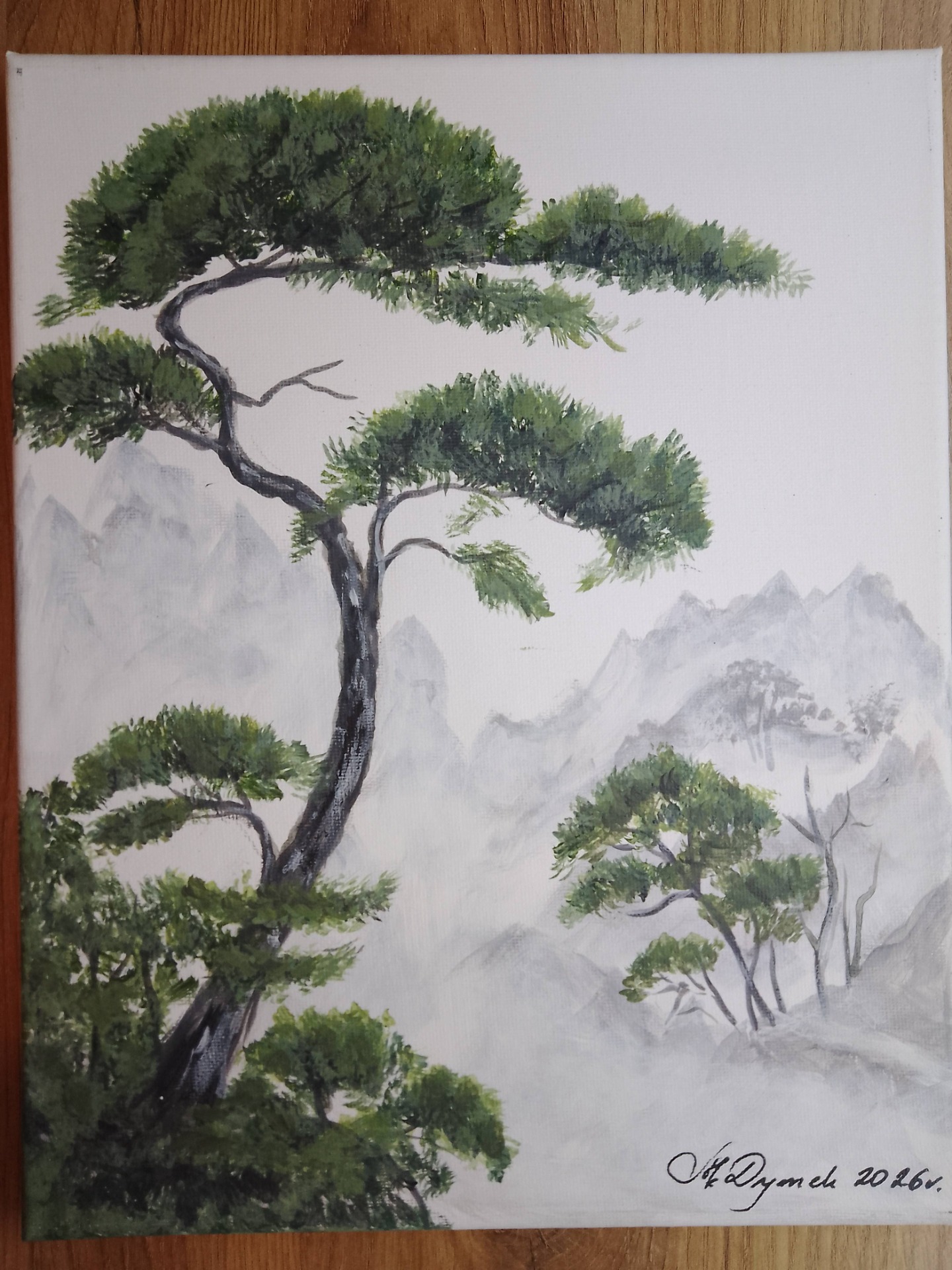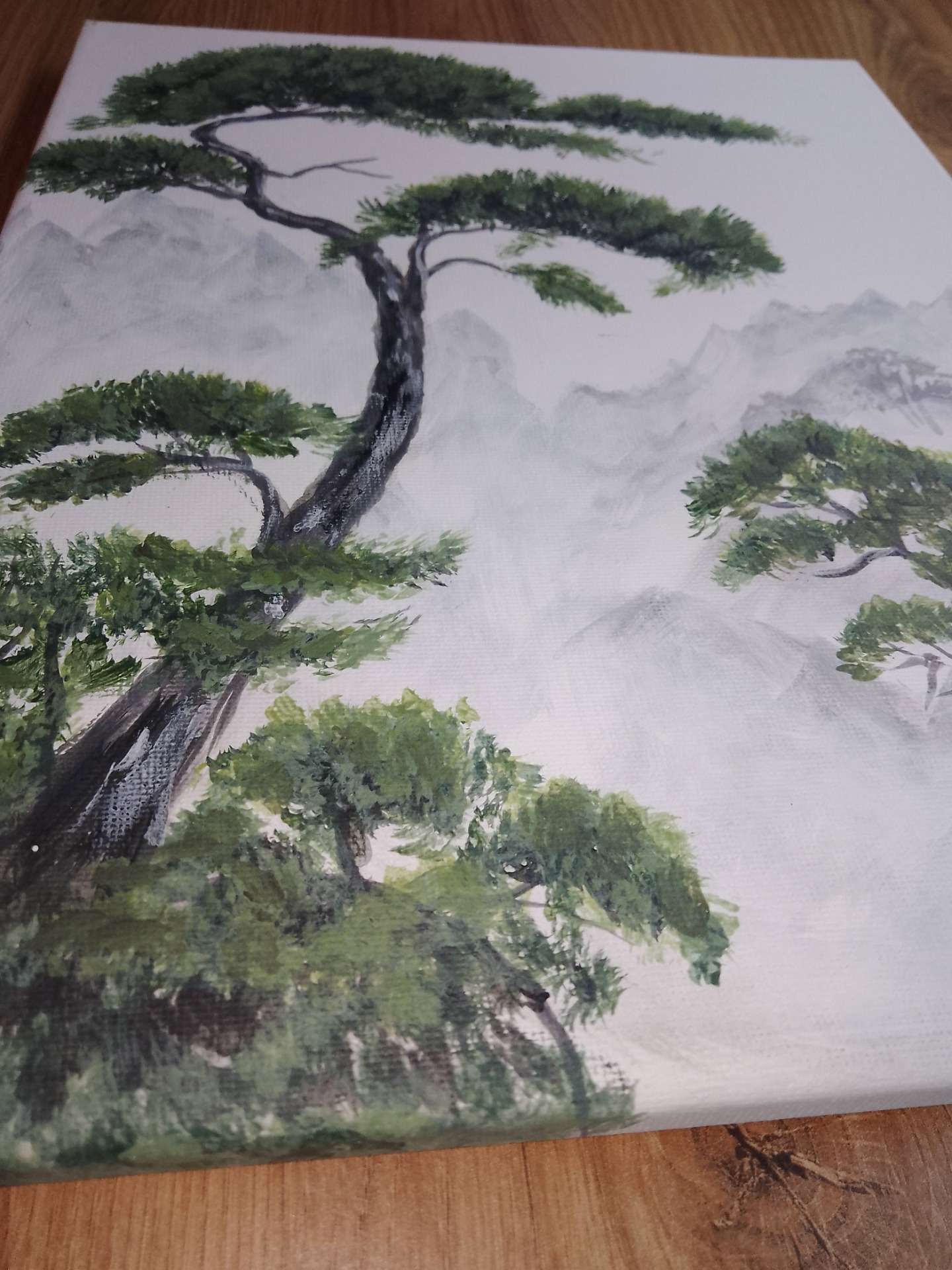 Wyjątkowy, ręcznie malowany obraz, łączący w sobie klasykę malarstwa dalekowschodniego z nowoczesną lekkością - malowniczy pejzaż inspirowany estetyką orientu. Przedstawia wiekowe sosny na tle zamglonych monumentalnych gór. Kompozycja symbolizująca trwałość, siłę i spokój ducha. Emanuje harmonią wprowadzając do wnętrza powiew natury oraz medytacyjną atmosferę. Przepięknie udekoruje ściany salonu, sypialni, czy gabinetu. Idealny również jako prezent na każdą okazję.