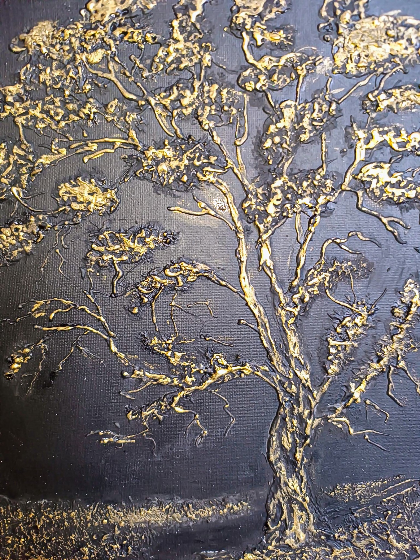 Dopełnij swoje wnętrze nutą luksusu - unikatowy, ręcznie malowany obraz przedstawiający majestatyczne drzewo w luksusowej odsłonie. Przenosi surowe piękno natury prosto do wnętrza, nadając mu spokojny, a zarazem silny i elegancki charakter. Obraz strukturalny (impasto) charakteryzuje trójwymiarowy efekt i sprawia, że dzieło "żyje". Obraz pracuje ze światłem, rzucając delikatne cienie oraz tworząc niesamowite poczucie głębi.