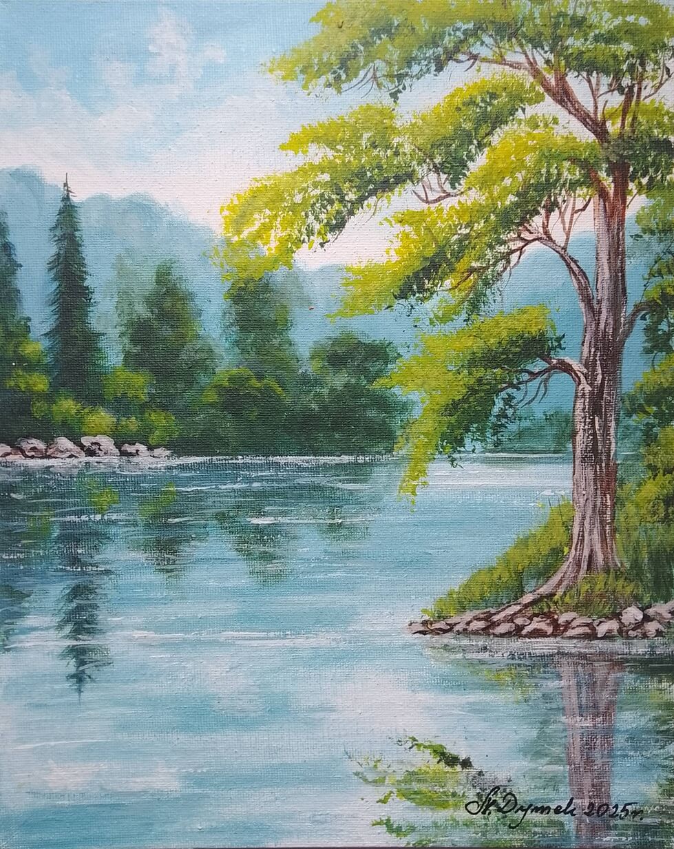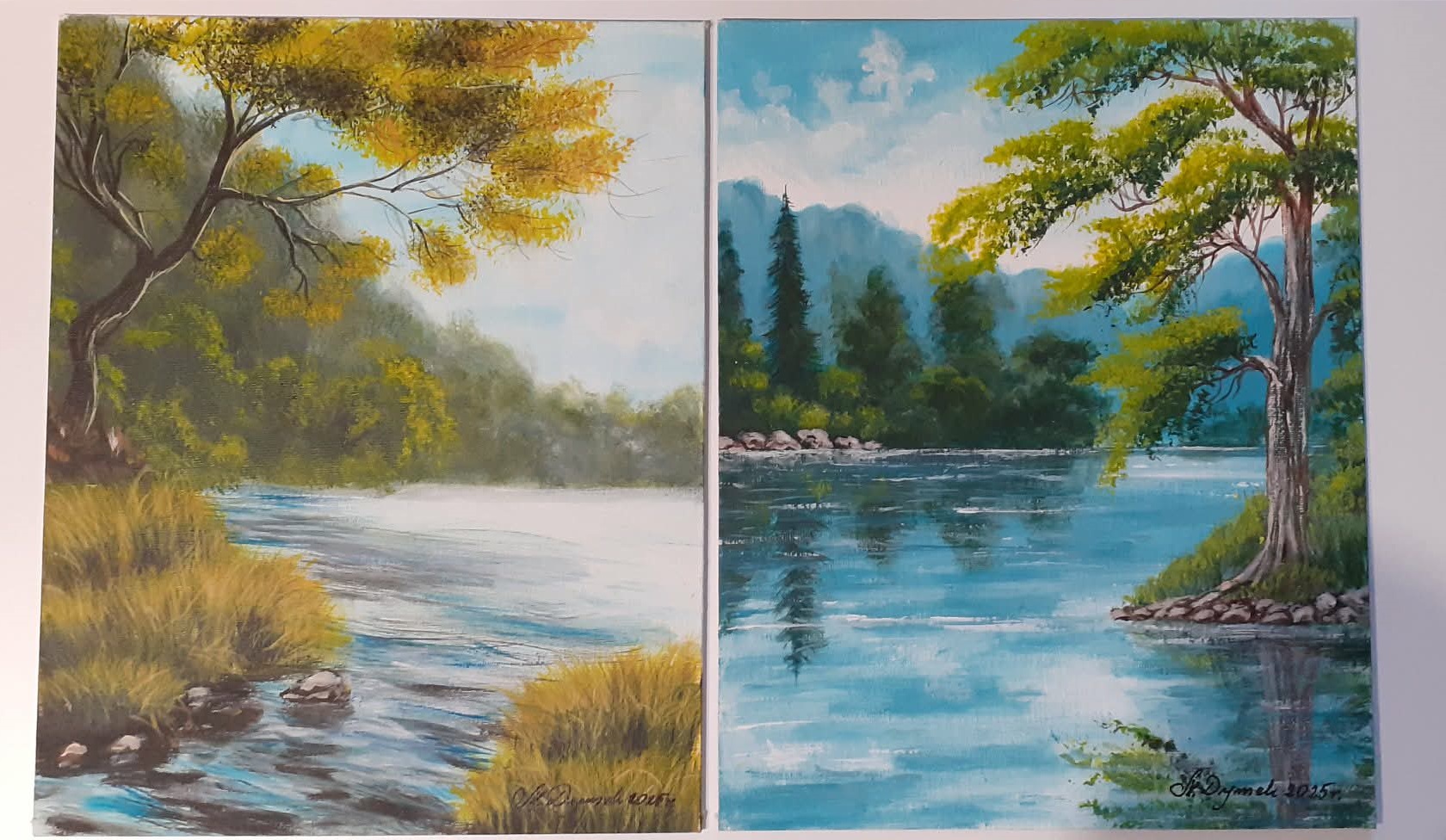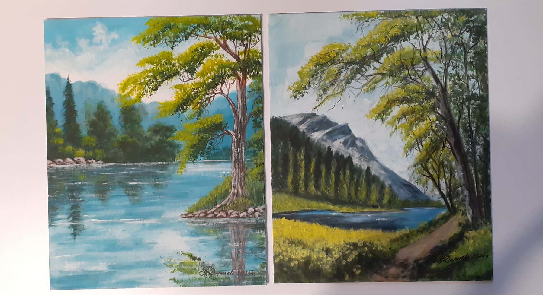 Tematyka: Polski krajobraz, malownicze pejzaże górskie nad brzegiem wody. Obrazy emanują ciszą i nostalgią